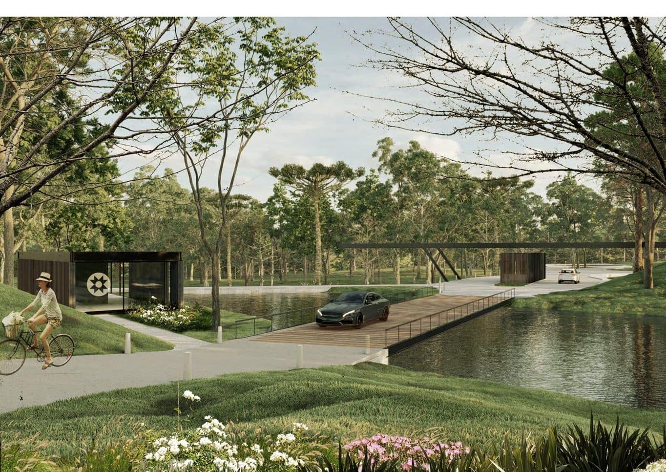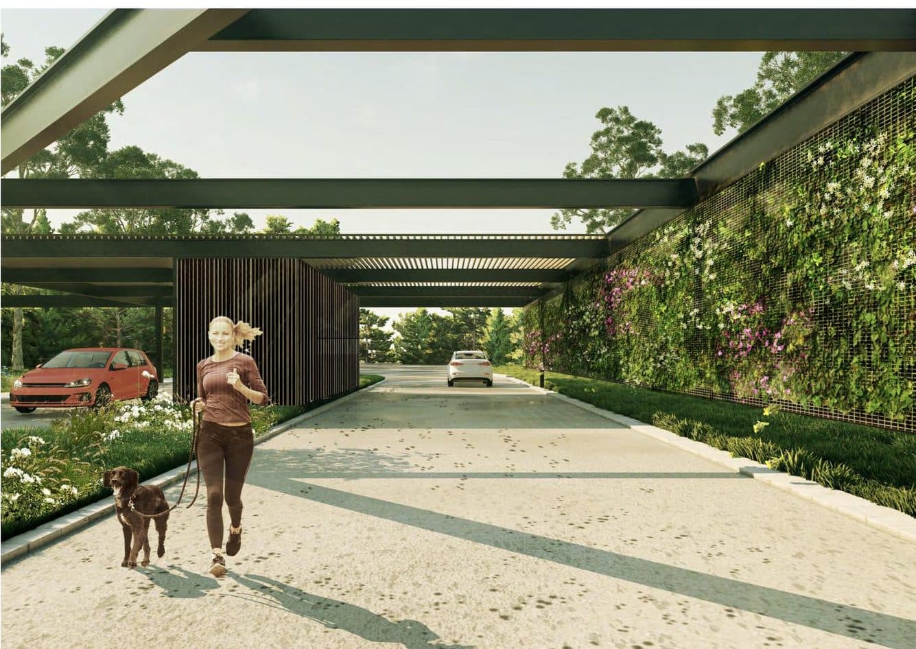 El resto de la estructura urbana interna queda definida por una red vial común que se acomoda a las características del sitio, definiendo a su vez un sistema de parques internos con más de 4 hectáreas. La resolución del sistema vial, en conjunto con el tratamiento paisajístico de los espacios de retiro frontal, permitirán preservar y amplificar las cualidades del verde natural, poniendo especial énfasis en la preservación del equipamiento forestal existente, donde destaca un gran parque central, con más de 800 metros lineales de desarrollo que cruza todo el polígono desde avenida Al Paso de la Cadena hasta la traza de la calle Fernando de Aragón. Este eje natural, preserva, conecta y equipa con el paisaje, organizando además los amenities de uso común como lagos, jardines, área deportiva, casa club, co-work y espacio de relax.