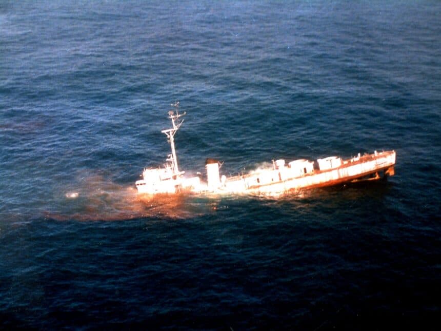 En 1995, frente a las costas del Río de la Plata, el histórico destructor DE1 ROU Uruguay —una de las naves emblemáticas de la Armada Nacional— vivió su último capítulo. Retirado de servicio y destinado a convertirse en blanco naval, el buque fue llevado mar adentro para una operación controlada. Pero lo que para algunos era un ejercicio técnico, para otros tenía el peso de una despedida: el final de una embarcación que había sido parte de la memoria marítima del país. Desde el aire, una imagen logró capturar ese instante irrepetible. El casco, ya inclinado, comenzaba a ceder ante el agua. No había dramatismo en el movimiento, sino una especie de solemnidad. Como si el barco, en lugar de hundirse, se retirara lentamente de la superficie que lo había sostenido durante años.La fotografía —tomada desde un helicóptero— congeló ese momento exacto en que el acero pierde su batalla contra el tiempo y el mar.