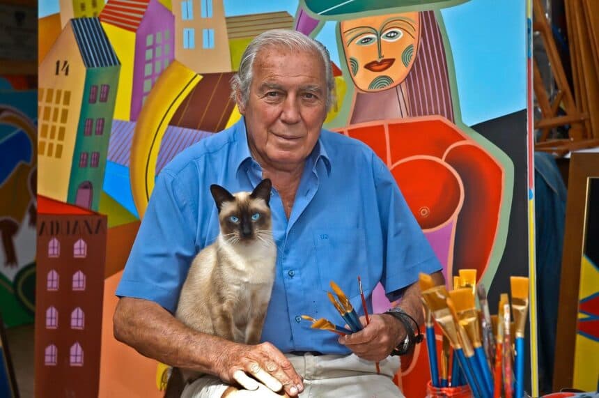 Sergio Restano llegó con su cámara y encontró a Carlos Páez Vilaró en una de esas escenas que parecen ya compuestas por la pintura antes de ser retratadas: con los pinceles en la mano, rodeado por su propio universo, junto a un gato siamés cuyos ojos celestes dialogaban con la camisa azulada del artista y con la atmósfera cromática de la obra. Todo parecía hablar el mismo idioma: color, creación y belleza.