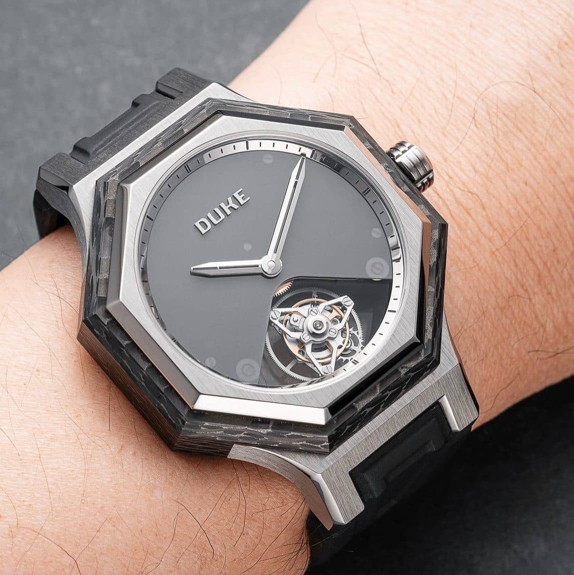 DUKE desarrolló carbono infundido con titanio o oro 18k, una innovación que combina ligereza, resistencia y lujo contemporáneo.