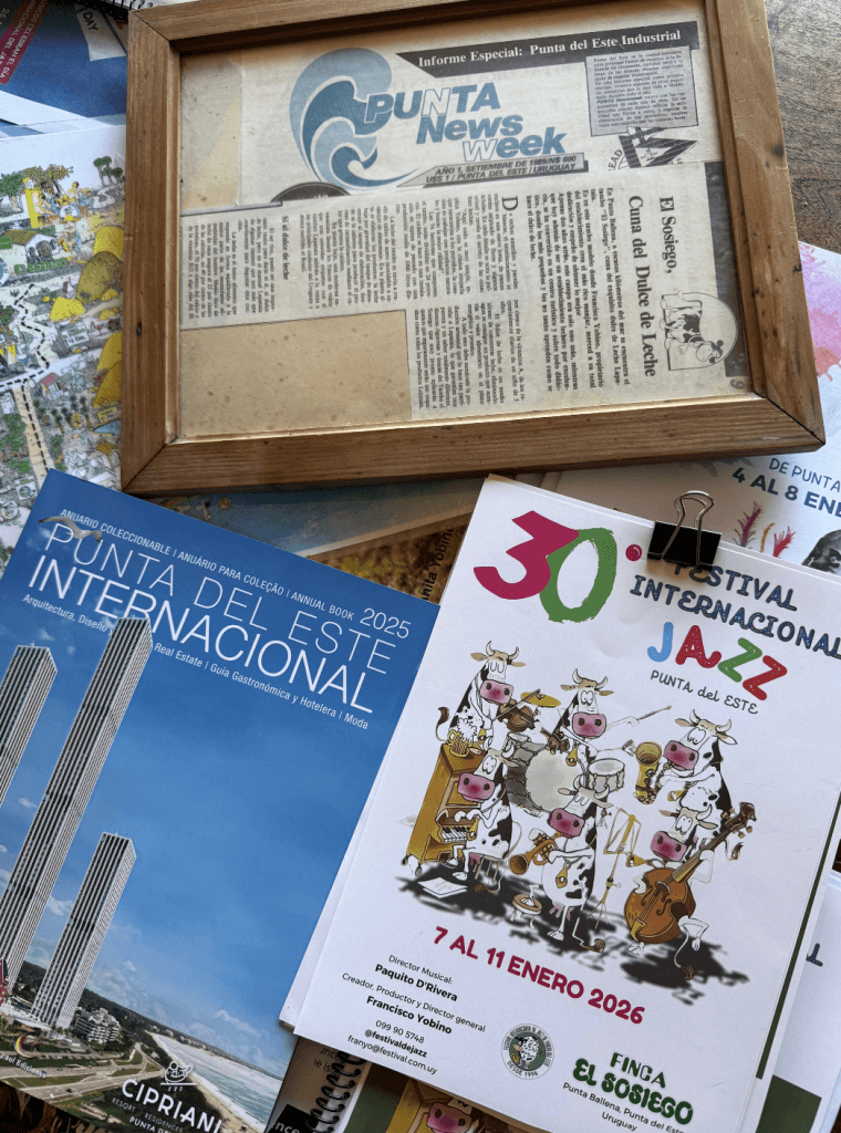 Y sobre una mesa conviven tres épocas: el recorte de Punta Newsweek, la edición 2025 de Punta del Este Internacional y el afiche del 30.º Festival Internacional de Jazz.