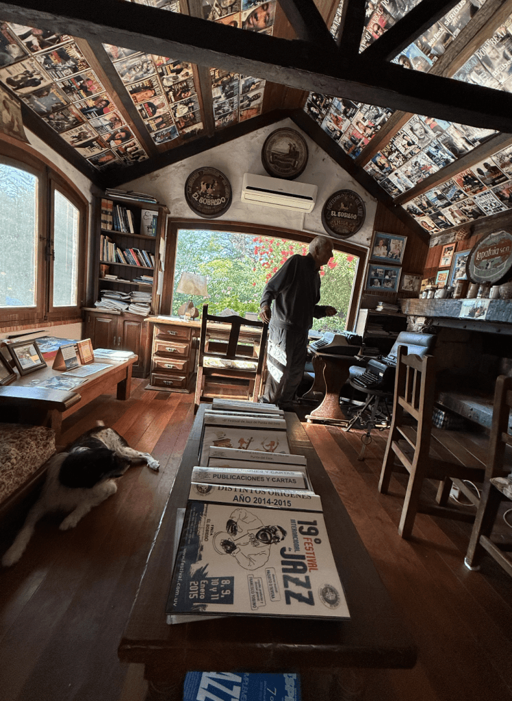 En una tarde de primavera encontramos a Francisco Yobino afinando cada detalle del Festival de Jazz. Nos abrió sus lugares sagrados —la oficina, el estudio, el galpón que aguarda el gran día— y caminamos su jardín, memoria viva de una vida entera. Sobre la mesa, mi primer trabajo en Uruguay —Punta Newsweek, 1989— dialogaba con la edición 2025 de Punta del Este Internacional y el afiche del festival, como tres estaciones de un mismo recorrido. Más tarde, en su biblioteca, vimos aquel libro que marcó un tiempo, “Punta del Este: arquitectura y paisaje”, y sentimos, como un golpe suave en el alma, que el tiempo no se detiene, y que a veces basta un libro en una repisa para volver a sentir quiénes somos: la suma de todo lo vivido y la gratitud de poder reconocerlo hoy, porque al final es la vida —y no otra cosa— la que nunca deja de enseñarnos.