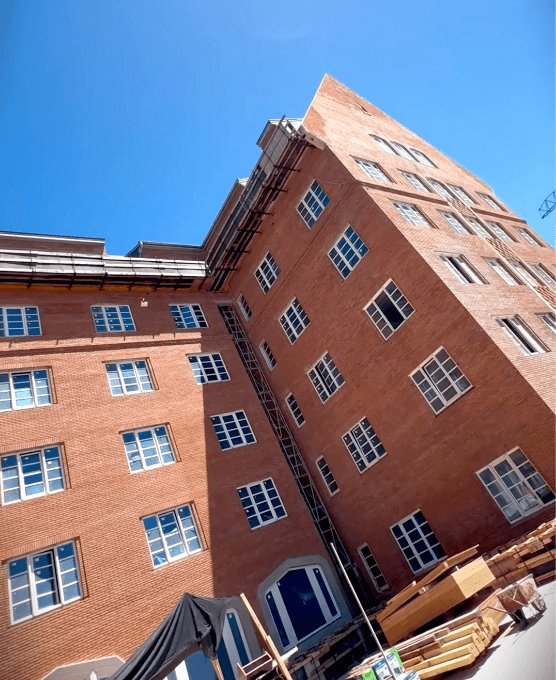Es entonces que aparece la señal más elocuente de la réplica: las paredes ya recubiertas con la nueva piel. No es un revoque: es una decisión. Más de 350.000 ladrillos hechos a mano, uno por uno, como si cada pieza tuviera una tarea doble: dar forma y devolver memoria. En esa piel se juega el gesto más difícil del emprendimiento: que lo nuevo no parezca disfraz, sino continuidad.