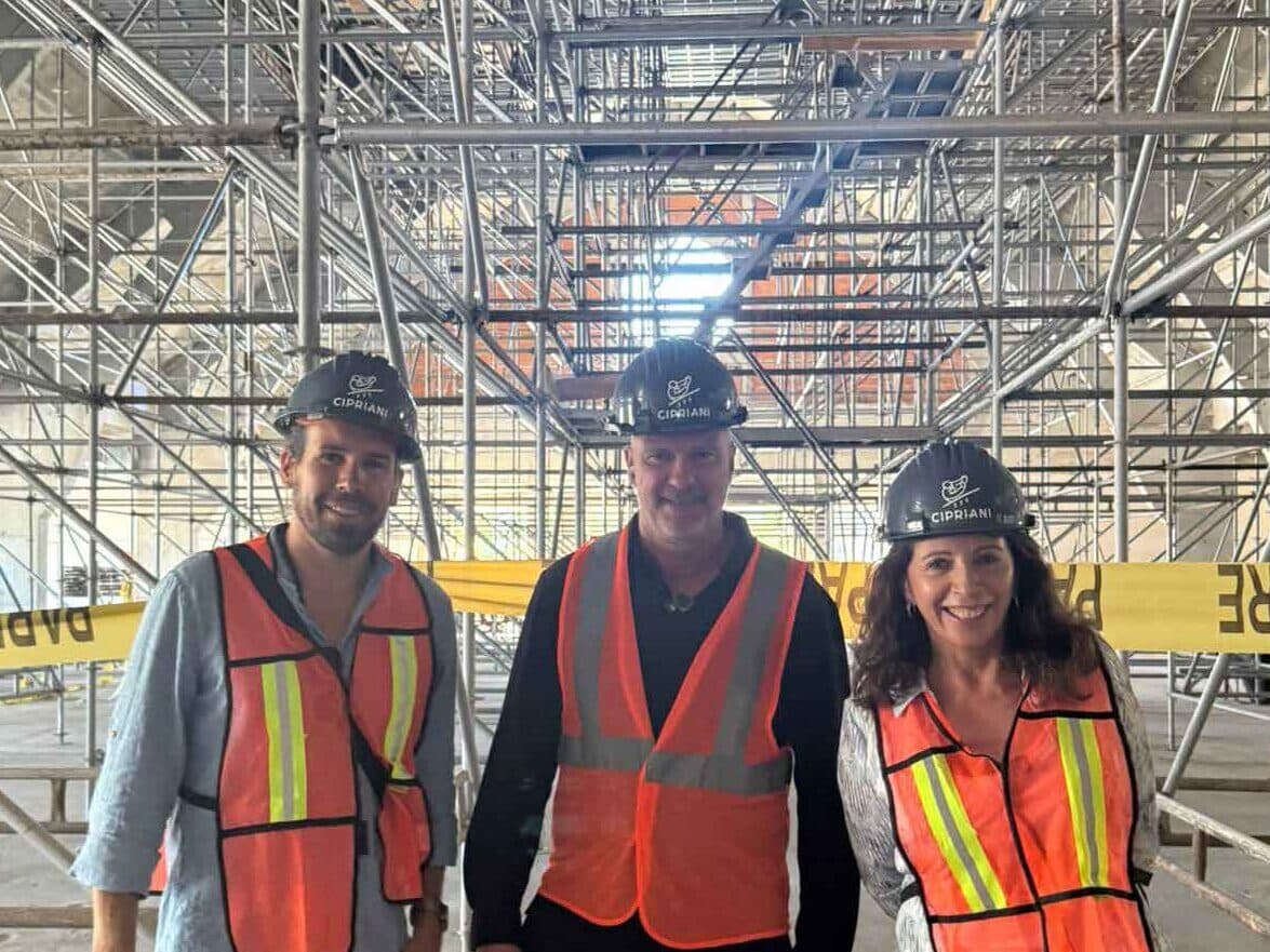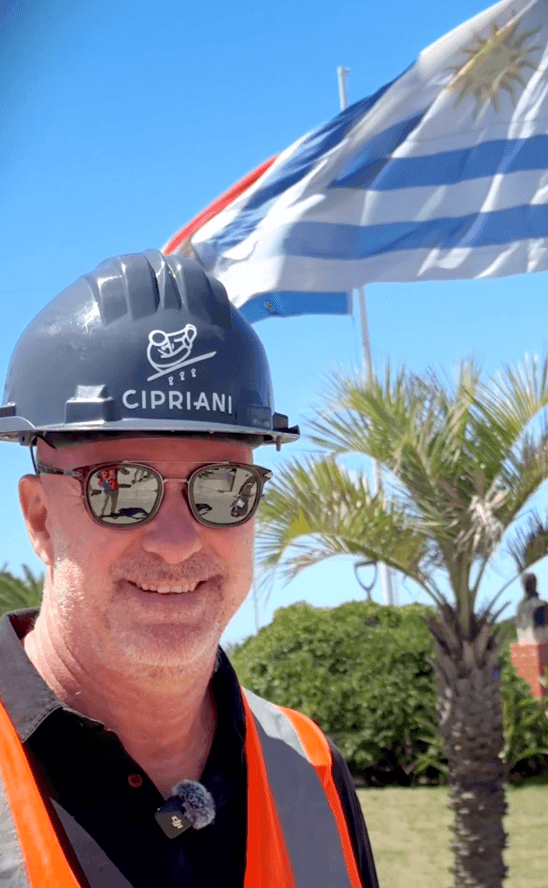 En el centro del recorrido estuvo Giuseppe Cipriani, no como logo, sino como presencia. Se detuvo con el equipo, saludó a los trabajadores y siguió el avance con conocimiento de detalle, como quien revisa una maquinaria donde cada minuto pesa. En el tramo del casino se sumó un dato concreto: personal italiano especializado en tareas de encofrado, integrado a un plantel técnico de alta especialización, con procedimientos y control que se sienten en el orden del conjunto.