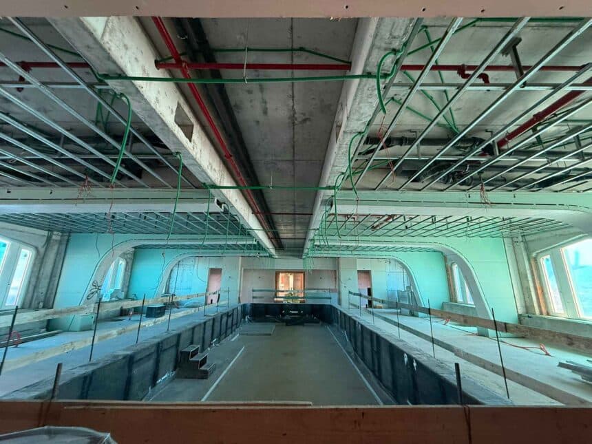 Hay datos que se comprenden mejor cuando se pisan. En el recorrido se vio el proyecto en su idioma real: columnas, pilotes, sectores de hormigón ya terminado y áreas técnicas que rara vez entran en la conversación pública —salones de servicio y espacios bajo el nivel del mar—, donde se entiende que el lujo de superficie necesita una infraestructura silenciosa para sostenerlo.