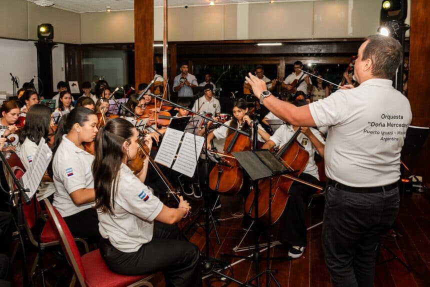El punto más emotivo llegó cuando subió al escenario la Orquesta Sinfónica “Doña Mercedes”, integrada por alumnos del Parque Educativo. Los jóvenes músicos viajaron desde Misiones para mostrar —sin discursos— cómo el arte puede volverse un motor de superación: basta con ver un violín en manos de quien aprendió a no rendirse.