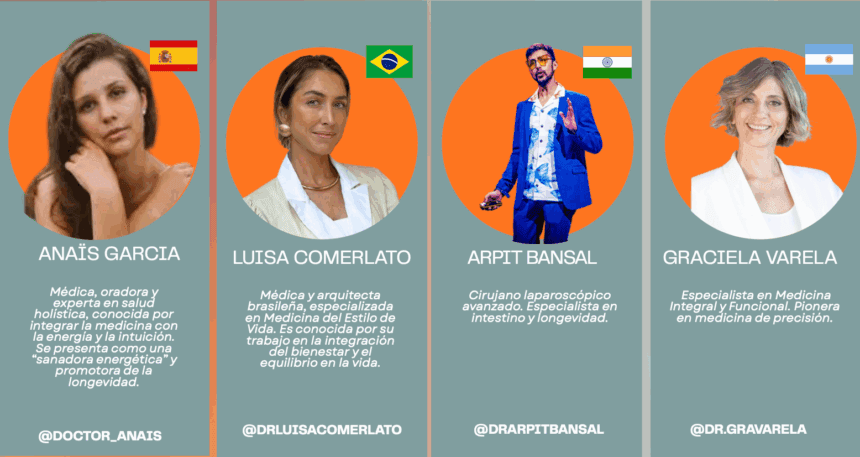 La grilla de speakers refleja el carácter global y multidisciplinario del encuentro. Participan referentes como Nathaly Marcus, especialista en nutrición funcional y epigenética; Ricardo Zimerman, médico infectólogo y divulgador científico; Martin Lombardero, especialista en imagenología cardíaca; y Coral Mujaes, mentora de alto rendimiento, entre otros profesionales de América Latina, Estados Unidos y Europa.