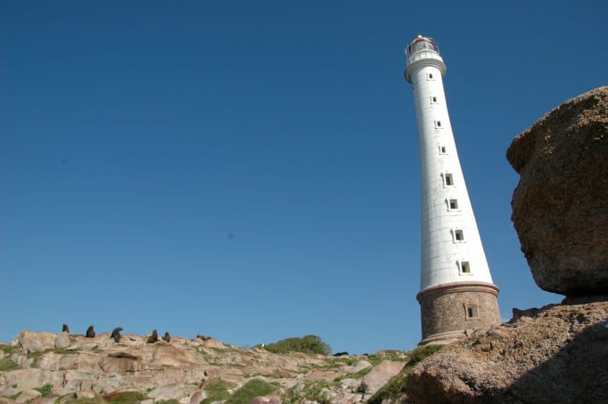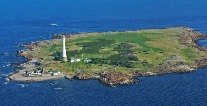 La isla aparece de golpe, como si fuera un territorio fantasma. Se incorpora de la nada en el horizonte inmediato. Lo primero que se observa es el faro, enorme y maravilloso: construido en 1906 y con 59 metros sobre el nivel del mar es uno de los faros mas altos del mundo. Desde su balcón exterior, al que se accede previa autorización y después de subir 240 escalones, se puede observar una vista panorámica de la Isla y de la costa de Punta del Este. En 2001, se convirtió en el primer faro «no tripulado» de Uruguay. A pesar de su notable elegancia, el faro no entraba en el menú elegido para este viaje, así que no hubo visita al lugar. En esta ocasión, los dos kayaks dieron una vuelta completa a la isla y recién descansaron sobre la chimenea semi hundida del barco Ciudad de Santander.