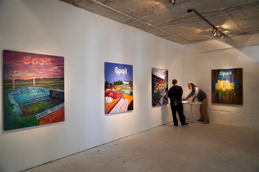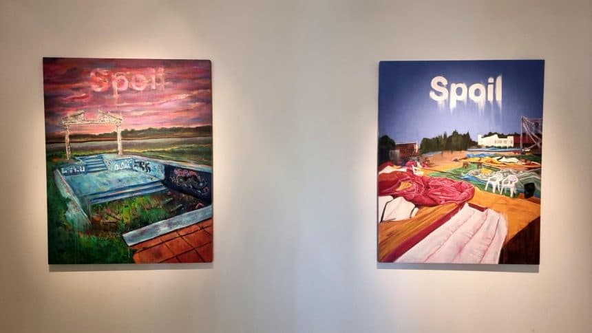 “En este caso Spoil significa podredumbre, lo que se echa a perder”, cuenta Iván. Además de su formación en artes visuales, Estévez trabajó durante años en marketing y diseñó especialmente una tipografía que actúa como logotipo y eje visual de toda la muestra. La obra, entonces, se despliega en varios planos, entre lo pictórico, lo conceptual y lo gráfico, proponiendo una lectura inquietante del futuro posible: uno sin humanos, pero con huellas visibles de su paso.